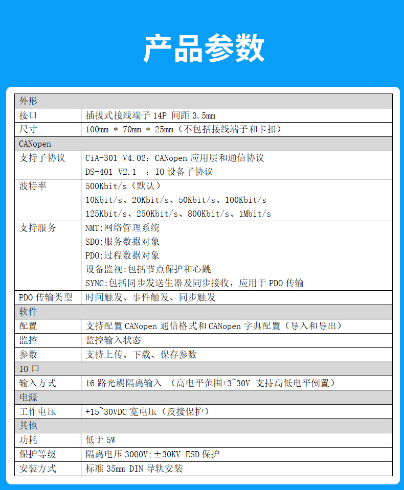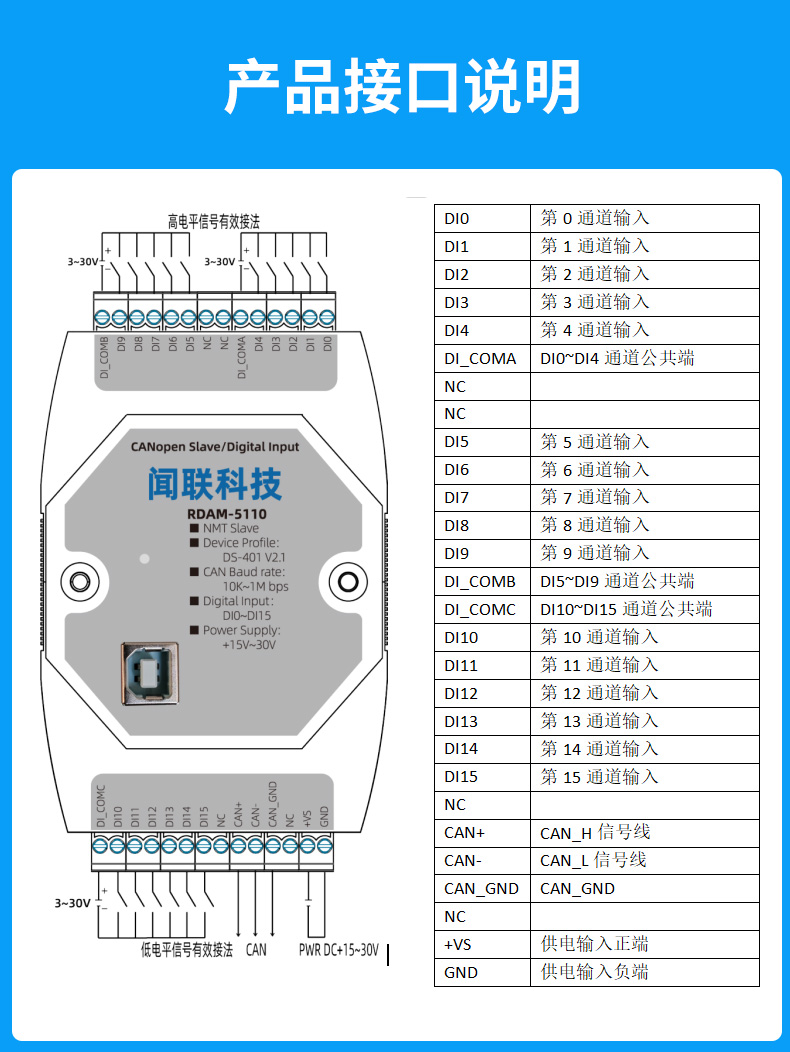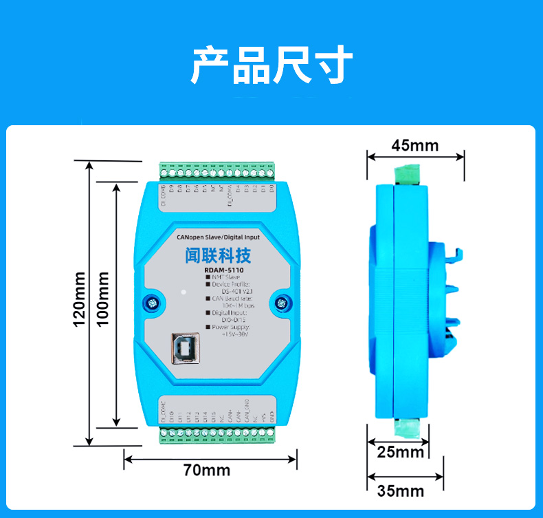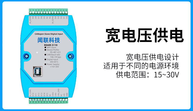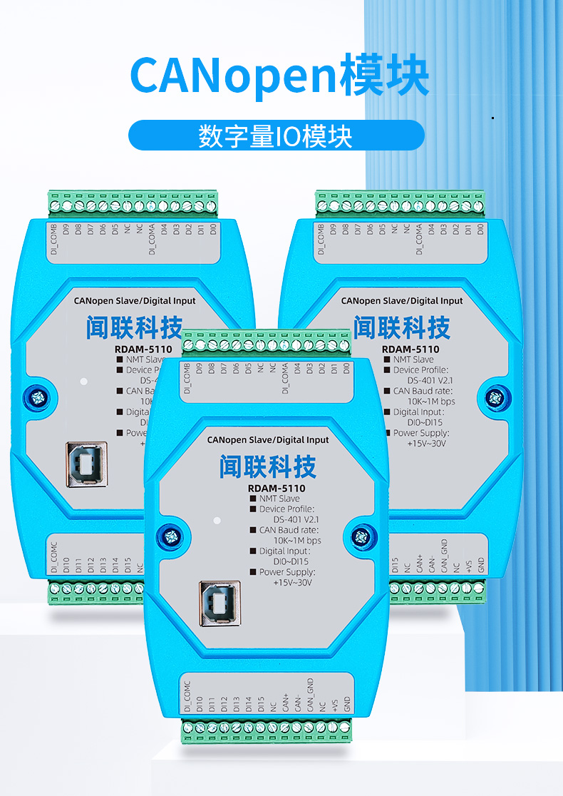 RDAM-5110是一個基于CANopen協議的遠程IO模塊,可以與組態軟件、工控屏、PLC等支持CANopen主機的設備組網。本模塊具有16路光耦隔離輸入,CAN通信全隔離適用于各種復雜的環境。