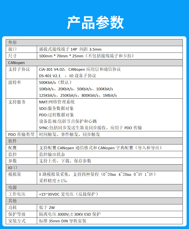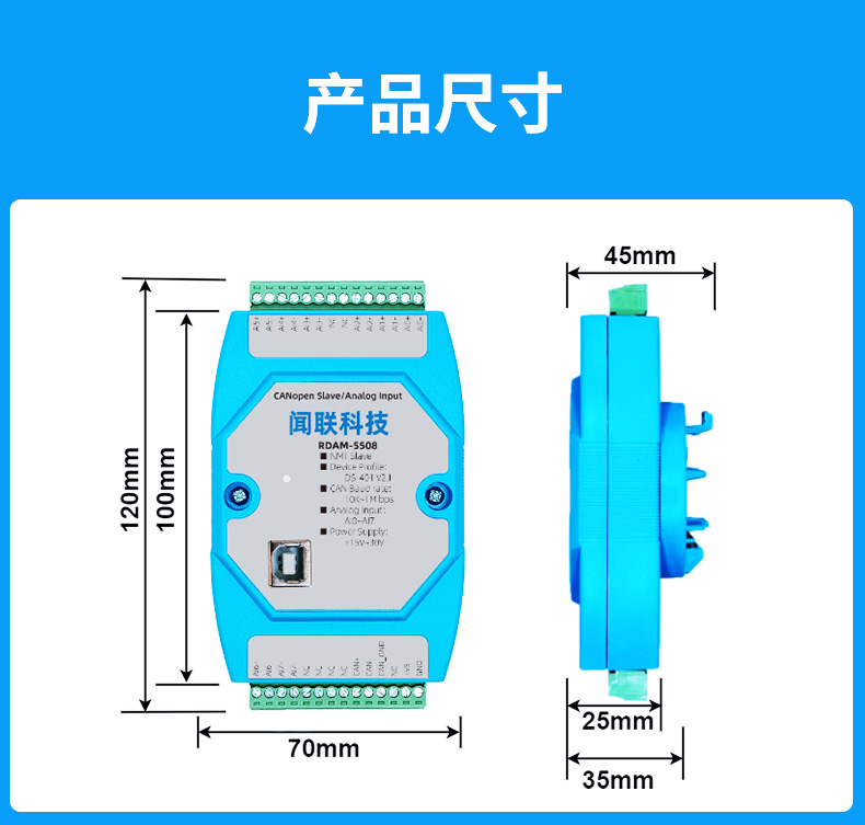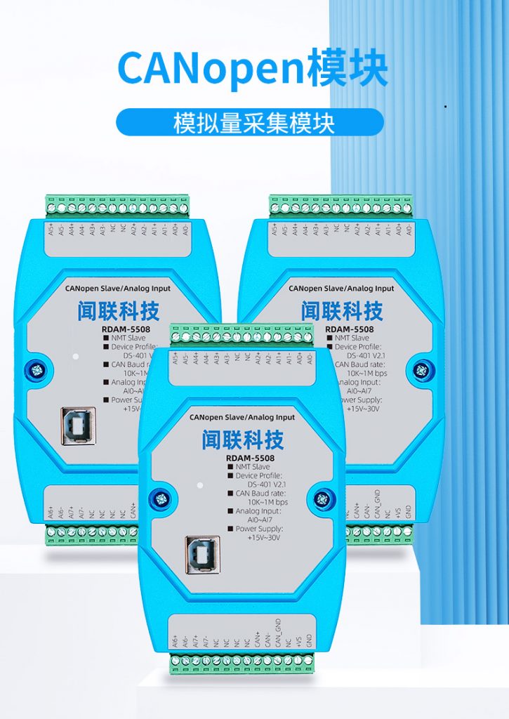 RDAM-5508是一個基于CANopen協議的遠程IO模塊,可以與組態軟件、工控屏、PLC等支持CANopen主機的設備組網。本模塊具有8路模擬量采集,CAN通信全隔離適用于各種復雜的環境。