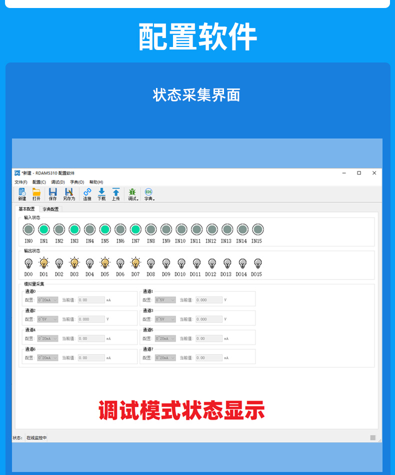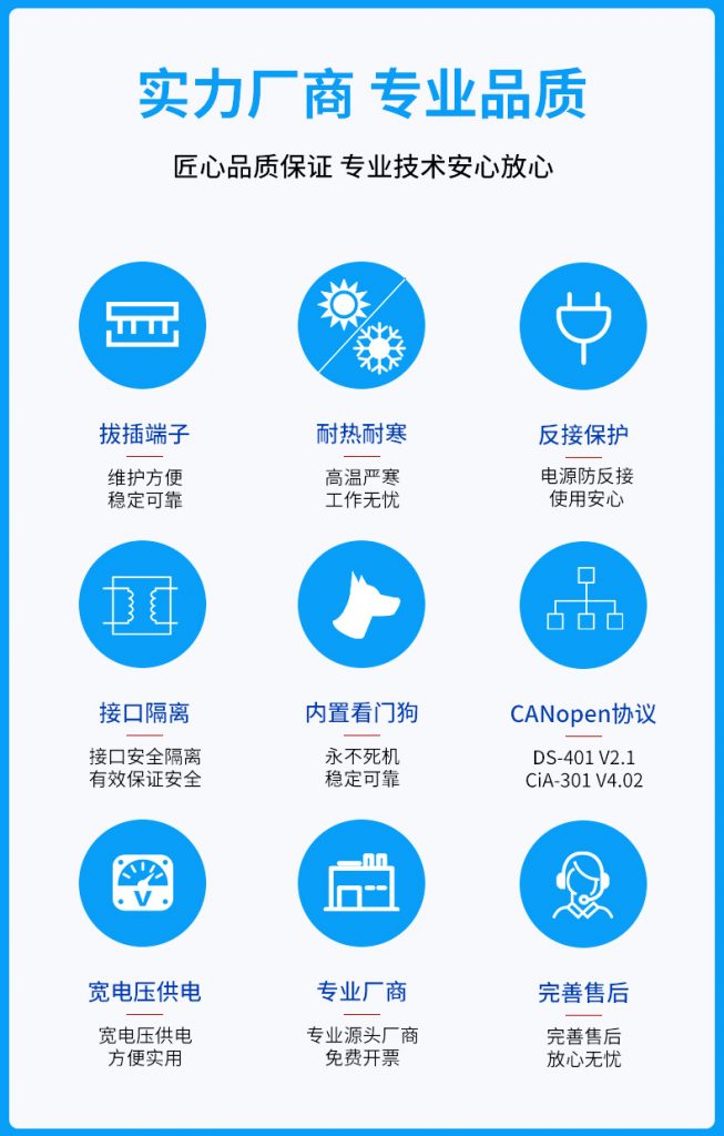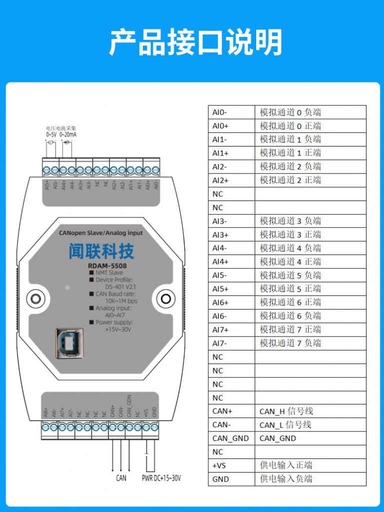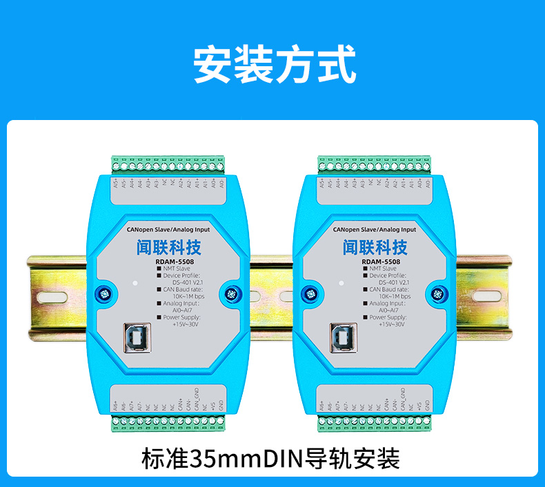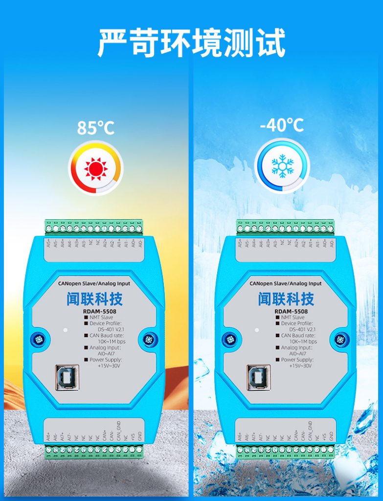 - RDAM-5508是一個基于CANopen協議的遠程IO模塊,可以與組態軟件、工控屏、PLC等支持CANopen主機的設備組網。本模塊具有8路模擬量采集,CAN通信全隔……